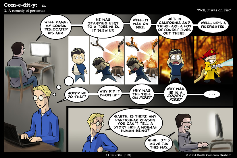 I should make it clear, in case for some unimaginable reason it isn't, that I am not bashing firefighters in any way shape or fashion. If I'm actually bashing anyone (which I don't think I am) it's the eco-freaks who won't let the forest be taken care of and have the brush cleaned out every now and then so those kind of fires don't happen. But I'm not going to deal with all that here and now. Unfortunately my cousin did dislocate his arm when a tree super-heated and exploded next to him. We are all quite grateful he was not killed or injured any more severely. This is a case and point, however, that anything can be made funny depending on how you tell the joke.