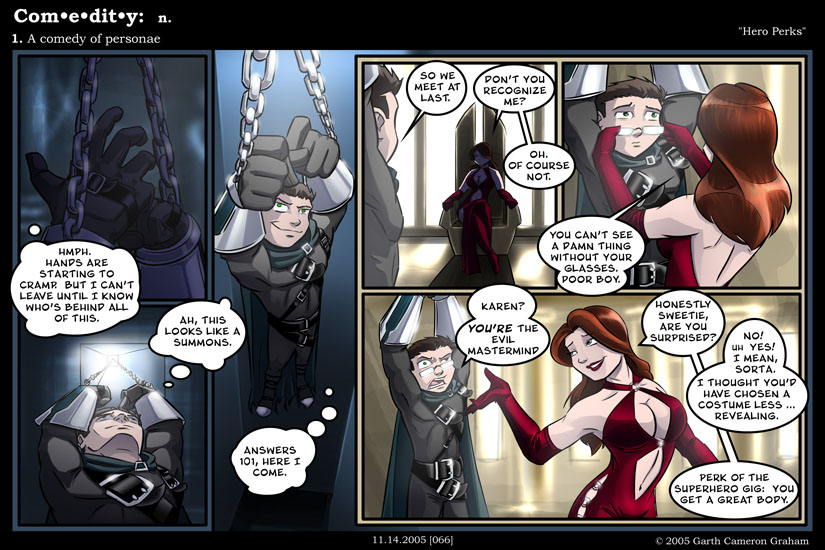 One of the other perks of superheros is that I get to draw them. Guess why I like to draw them? Good guess. Anyway, I need to now go draw a train. Superheros would be much more fun, but gotta do the train. I'll have more to rant about once I've finished the train drawings. It's only just monday and I already wish the week were over. You know what would be a cool super power? Hands that can't cramp up when you draw too much. That'd be sweet. New shinies behind the vote buttons, and I think I'm going to turn the last pannel into a wallpaper. Yes, I know I'm behind on those, but ... I do have next week off, so I'll probably spend it churning out drawings. Good news, eh?