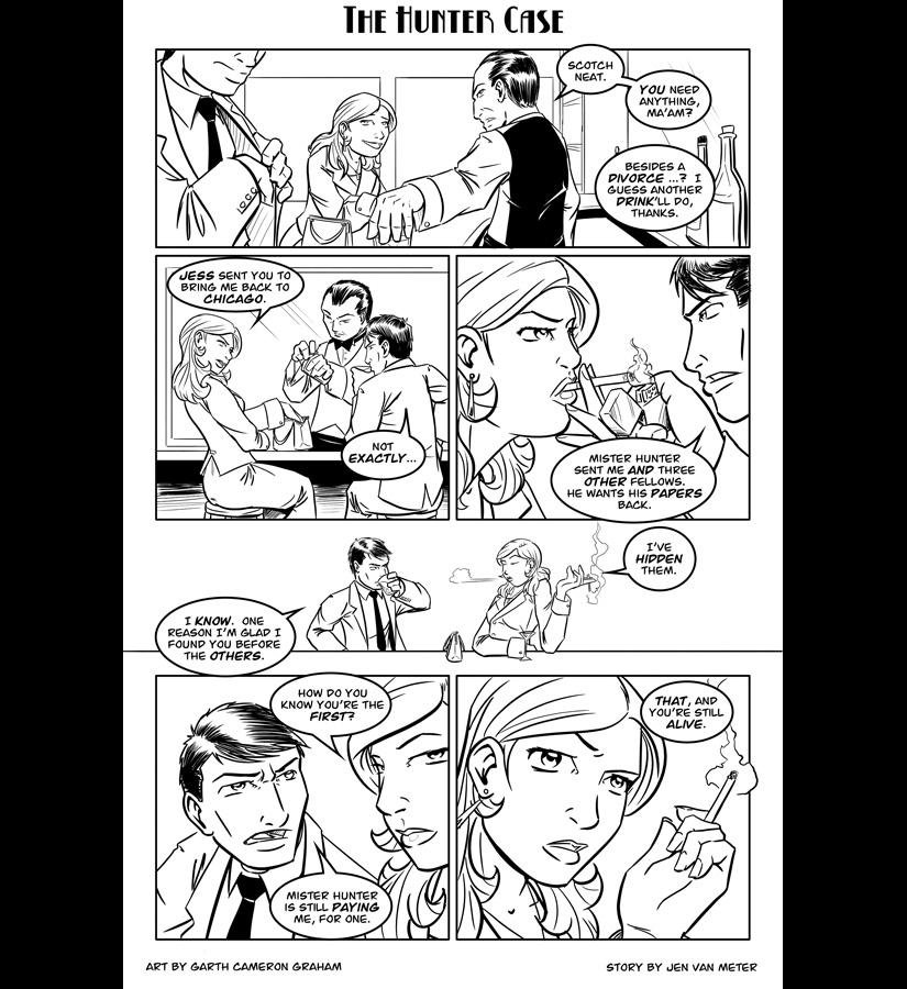 You might well be wondering what the devil this is. It's not comedity. did you get the url wrong? Has garth abandoned the comic? Has he finally gone off the deepend? Well, the latter is closest. This is actually the first of five pages for a portfolio related thing. Oni publishers handed out scripts and said "draw this and we'll see if you can make it in the biz." so here I am. more to come after a little sleep. This page was inked by hand... still not 100% convinced it's better than digital... but ::shrug:: oh well.